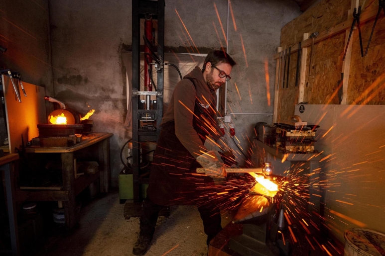 Dans le petit atelier qu’il s’est construit à l’entrée de Cuarnens, la forge est minuscule, alimentée au gaz. Normal, Julien Guiraud n’y travaille l’acier qu’en petits blocs, dont il fait des couteaux de cuisine ou de table. «Mon four peut monter à 1200 °C, c’est largement suffisant et c’est rapide à mettre en chauffe.» Avant, le trentenaire travaillait sur une forge au charbon, plus aléatoire et dont les températures extrêmes pouvaient transformer le métal en liquide si on ne le surveillait pas assez.