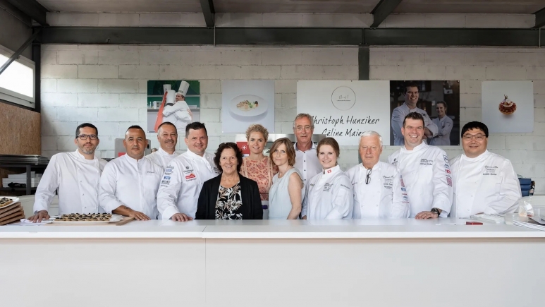 Le cuisinier décédé rêvait de fournir aux candidats suisses du Bocuse d'Or au concours gastronomique une cuisine dédiée. C’est désormais réalité. (Sur la photo de Pierre-André Fragnière, l’Académie du Bocuse d’Or entoure Franck Giovannini, Anne-Marie Débieux-Rochat, Laurence Rochat et Lucien Mosimann dans la nouvelle cuisine).