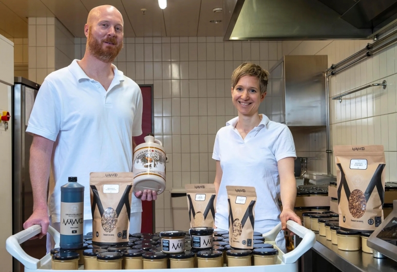 Mawoo fabrique, à Morat, de magnifiques douceurs avec le sirop bio de sa propre érablière canadienne. Sur la photo, Nadine Ringgenberg et Fabrice Vuilleumier, responsable de la production, parmi quelques-uns de leurs produits.
